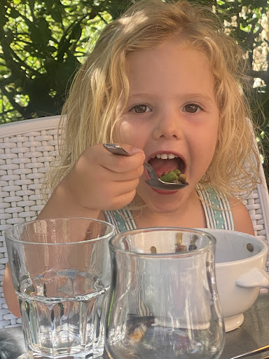 Achter in de tuin van Le Casse-Graines, in de luwte van de schaduw en met het zachte geroezemoes van andere tafels op afstand, genoten we van een bijzondere maaltijd die in alles doordacht en smaakvol was. De setting was eenvoudig maar perfect: rustgevend, zonder opsmuk, precies wat je hoopt op een warme vakantiedag.