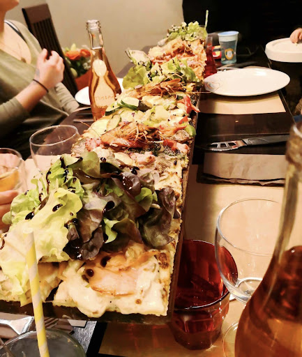 Read moreJe ne vais malheureusement pas faire très original : Attendre, attendre, attendre... Service extrêmement long. Nous étions 13 et nous n'avons pas tous mangé en même temps tant le service s'est étalé. Les premiers étaient servis quand on est venu nous demander de choisir autre chose car il manquait tantôt des crevettes et du safran pour des risotto, tantôt des mousses au chocolat. Il a même fallu réclamer un dessert qui n'arrivait pas. De plus, les serveuses n'ont pas de tables attitrées. Nous avons eu différentes serveuses, c'est un peu particulier. Ceci dit, elles sont souriantes et agréables malgré la cadence. Je plains le personnel qui court partout. C'est clairement le bord3l ! Le restaurant était bondé, un défilement permanent pour les commandes à emporter et une salle privatisée très festive ont rendu le lieu très bruyant. 2H30 dans la cacophonie, c'était longggggg ! Le décor est superbe avec son plafond de verdure, salle moderne et propre ainsi que les sanitaires. Malgré tous ces points négatifs, la cuisine est excellente. Carte bien fournie pour tous les goûts entre les pizzas, risotto, pâtes...Ma pizza à l'andouille était absolument délicieuse. Un vrai régal et bien garnie ! Celle aux noix de Saint-Jacques de mon voisin était super bonne aussi. Cuisson et assaisonnement parfaits. Super qualité. Par contre les pâtisseries ne sont...