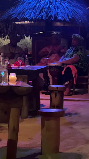 We moored our boat in the bay just a short dingy ride to their dock. The sound of Polynesian music comes from inside. A live four man band plays in the center of this open air restaurant. Their music. Was amazing and they had joy in their faces while playing. Lots of authentic Polynesian songs, but over half of them were cover songs of popular American music like Pink Floyd, Elvis, and many others. When listening, you don’t even realize it is a cover song as it sounds, so Polynesian.