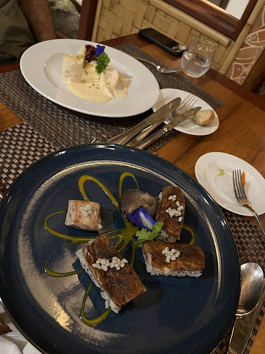 Nous avions réservé à 20h au restaurant. Nous sommes arrivés à 19:45 au bar pour boire un cocktail au bord du lagon. Nous nous sommes dirigés vers le restaurant vers 20:15, l’accueil des collaborateurs du bar et du restaurant était très agréable. Après la prise de commande (1 entrée / 2 plats) nous avons reçu chaleureusement un amuse bouche, suivi, sans avoir eu le temps de goûter à celui ci, de l’entrée. Service plus que rapide déjà pour commencer. Les plats sont arrivés en 4 minutes après l’entrée. Ces derniers étaient trop cuit (tant pour le saumon Dieu que pour le poulet farcie où je cherche encore la farce), la garniture fade et presque froide. Étant donné que nous étions les derniers à arrivé dans le restaurant, l’équipe nous a gentillement fait comprendre qu’il fallait qu’on parte (proposition des desserts alors que les plats étaient encore sur table). Nous avons donc pris la décision de finir la bouteille de vin au bar, alors qu’il n’était que 21:15. Retour au bar, 21:10, les collaborateurs nettoyait et rangeait la terrasse. Bref, on est reparti le cœur lourd pour notre soirée de vacances, et à seulement 21:30. Merci quand même à l’équipe d’accueil pour leur sympathie et...