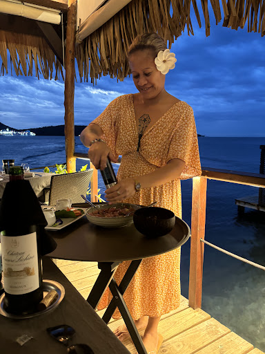 Secondly, our group ordered dinner and a 8700 xpf ($87) bottle of wine. We had enough time left during dinner to order a second one. We were looking for a