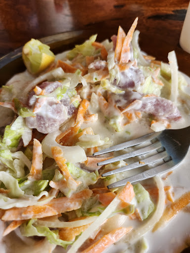 Read moreNous nous baladions le long de la plage de Matira à la recherche d'un restaurant authentique. Le portail en bois est ouvert, alors on entre. Nous sommes accueillis par une dame sans âge qui nous tend des cartes plastifiées assez usées. Nous nous installons, seuls touristes là, alors que des locaux discutent autour de bières. Nous consultons la carte avec appréhension et arrêtons notre choix sur le poisson cru et les nouilles au bœuf. La vue est splendide, les enfants jouent sur la plage et le soleil tombe dans l'océan. Quelques minutes plus tard, une autre dame vient nous servir. Assiettes rudimentaires mais portions généreuses. Et là, tout est bon. On se régale avec cette cuisine maison. Le poisson cru est à tomber et les nouilles sont très bonnes. On ne laisse rien dans l'assiette et comme la nuit est tombée, nous savourons ce repas aussi bon que surprenant. On finit notre soirée sur la plage, sans dessert car il ne faut pas s'attendre aux prestations des restaurants des hôtels environnants enchantés par ce que nous venons de découvrir.