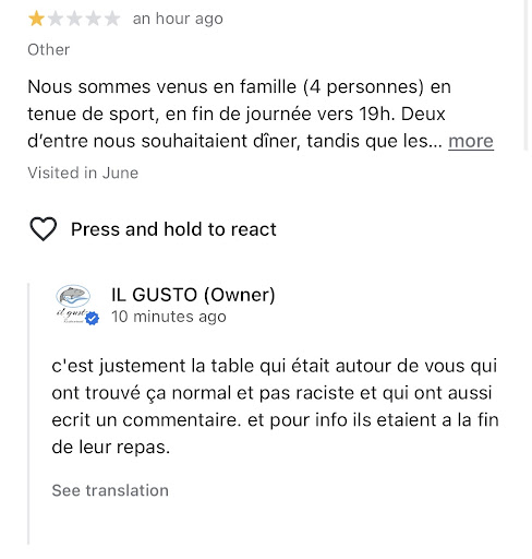 Votre réponse est encore une fois à côté de la plaque. Le fait qu’une autre table autour de nous ait trouvé cela “normal” ne justifie en rien votre attitude déplacée ni vos propos incohérents. Ce n’est pas à d’autres clients de décider ce qui est raciste ou irrespectueux. Ce que nous avons vécu, c’est un accueil froid, des remarques sans fondement, et une règle absurde imposée sans explication.