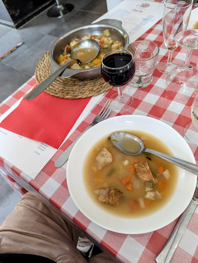 Celui ci ne déroge pas , ses tables aux nappes à carreau rouge , sa roue de charette à l 'entrée , ses fourches en bois suspendues au mur ... Première impression : on est bien