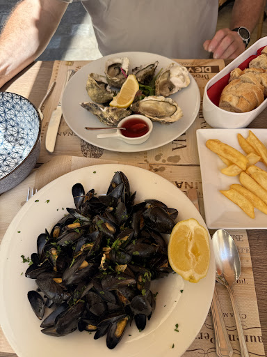We went for the set menu option (âŹ30 or âŹ35 per person for starter, main, and dessert), and it was honestly great valueâespecially for the location. We had six oysters and a plate of mussels to start, served with chips and baguette. Then came pan-fried prawns and seabass with potatoes and salad. For dessert, we had crĂšme brĂ»lĂ©e and lemon sorbet. Everything was fresh, tasty, and the portions were just right.