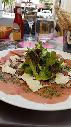 Read moreJe ne suis vraiment pas difficile, mais je déconseille... La formule midi , dont le rosé que je n'ai pas pu boire, "c'était un rosé Français" voilà le descriptif que j'ai eu .. L'entrée c'était 2 Petites fleurs de courge sans goût sur peut être 5 feuilles de roquette. Et le plat c'était un petit carpaccio sans goût. Frites sans goût aussi. 😂 ( Je parais chiante, mais vraiment ) Heureusement qu'il y avait du poivre du sel du ketchup et de la mayo, ce qui paraît inconcevable a mettre sur ces deux plats... Et la serveuse charmante, mais en colère ... Bref, je regrette, je suis peut être mal tombée au vu des notes ... J'ai encore faim et soif,...
