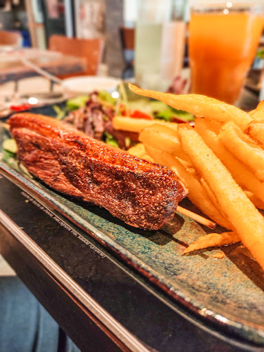 Ich nahm die Entenbrust und betone sie möglichst rot haben zu wollen. Gar nicht so leicht zu erklären, wenn das Vis a vis kein Englisch spricht. Was kam war ein perfekt gebratener Spieß. Zart/mild gewürzt, toller Eigengeschmack und sehr gute Fleischqualität. Dazu Frenchfries und Salat. Die Fries auch von ungewohnt guter Qualität für die Region. Der Salat durchaus Standard.