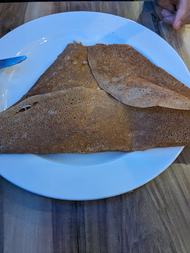 Read moreNous avions choisi cette crêperie car ouverte de 12h a 23h sans interruption. A notre arrivée, nous sommes les seuls clients. Le serveur (peu aimable) nous installe sur une table d'une taille pour 1 personne (alors que nous étions 2), c'est déjà pas très respectueux au vu de toutes les tables de libres. Ce n'est pas par que nous n'allons pas consommer beaucoup que nous devons mal être accueillis. Ensuite, après avoir finalement pris notre commande il nous sert "l'assiette de tapas" à 9.80 qui se résume à une crêpe jambon / fromage / chèvre coupée en triangle. Cependant c'était très bon, après pour 10€ ya plutôt intérêt 🙄