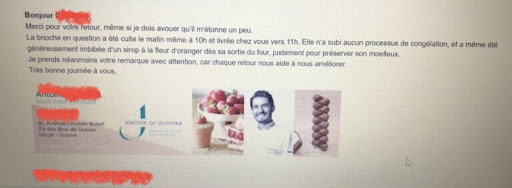 Read moreNous avons été très déçus par la réaction de Mr De Oliveira ! Nous avons acheté différentes pâtisseries que nous avons trouvé délicieuses ; en revanche nous avions également acheté une galette que nous avons trouvé sèche et bourrative (d'ailleurs elle a fini à la poubelle). Dans le but de l'informer de notre insatisfaction, nous lui avons adressé un mail mais nous avons été extrêmement surpris par sa réaction : en effet, celui-ci nous a proposé de venir de suite chercher une autre galette (probablement la seule qu'il lui restait en stock) et lorsque nous lui avons fait part de notre impossibilité de venir le soir même, il n'a proposé aucune autre alternative ! Nous lui avons donc envoyé un mail qui est resté sans réponse ! Cette attitude et cet incident ne reflètent en aucune façon la qualité et la réputation de cet établissement. Nous restons sur une sensation de très grande déception ! Bon vent Mr...