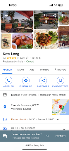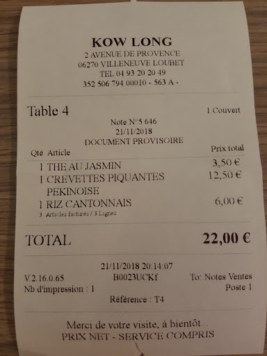 Bonjour, Tout d'abord, je tenais à préciser que la cuisine chez KOW LONG Villeneuve-Loubet est délicieuse pour moi et pour mes amis (es), nous sommes ravis ! 😋😋