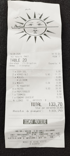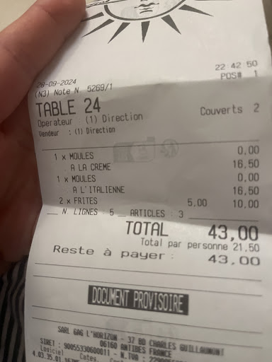 Voici mon commentaire initial : Moules Roquefort très bonnes, jus sirupeux et pas trop salé. Goût roquefort pas trop prononcé. Dommage pour la quantité que je trouve peu généreuse malgré le prix de 16,50€. Malheureusement j'ai eu beaucoup de moules restées fermées (une vingtaine) qui étaient donc non-consommables. Merci au chef d'avoir proposé une petite portion en dédommagement. Gros bémol pour la frite à 5 euros en accompagnement, nous ne pouvions pas passer à côté en mangeant des moules, mais je trouve très cher la poignée de frites (20 euros pour les 4 petites portions, ça fait cher le kilo de pommes de terre...) Bons desserts faits maison, mais encore une fois, le prix de 12 euros pour un fondant chocolat n'est pas justifié pour moi (j'aurai aimé que la chantilly soit faite maison par exemple). C'est un détail mais nous avions commandé trois apéritifs, la table d'habitués à côté de nous aussi, ils ont eu des gâteaux apéro, pas nous. Je trouve l'ensemble des prix élevés (voir notre ticket de caisse), sûrement dû à l'emplacement touristique. Le cadre du restaurant est agréable, malgré le bord de route bruyant....