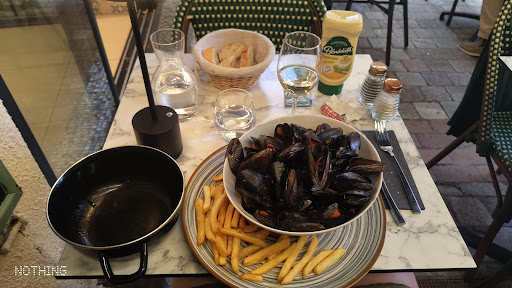 I ordered moules frites, the mussels were great and the fries really good. But the soup was very oily like a bad lip balm. Also not the most amazing tasting. The bread was stale.