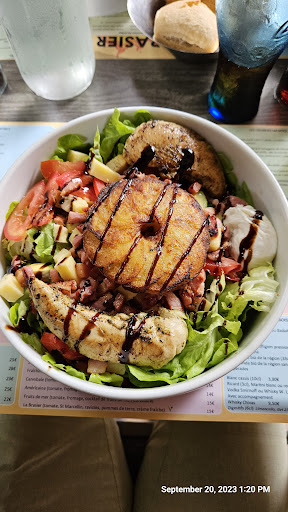 We ordered two large salads--the compagnarde salad and the tiede de gambas (prawns) salad. OMG, they were large, fresh, and delicious. Honestly, two of the best salads we've had in a long time. Neither one of us finished everything, but we wanted to. We managed to squeeze in one scoop of mint chocolate chip ice cream between the two of us. It was also excellent. We highly recommend this restaurant when in St Paul de Vence or in the Vence area. You will not be disappointed.