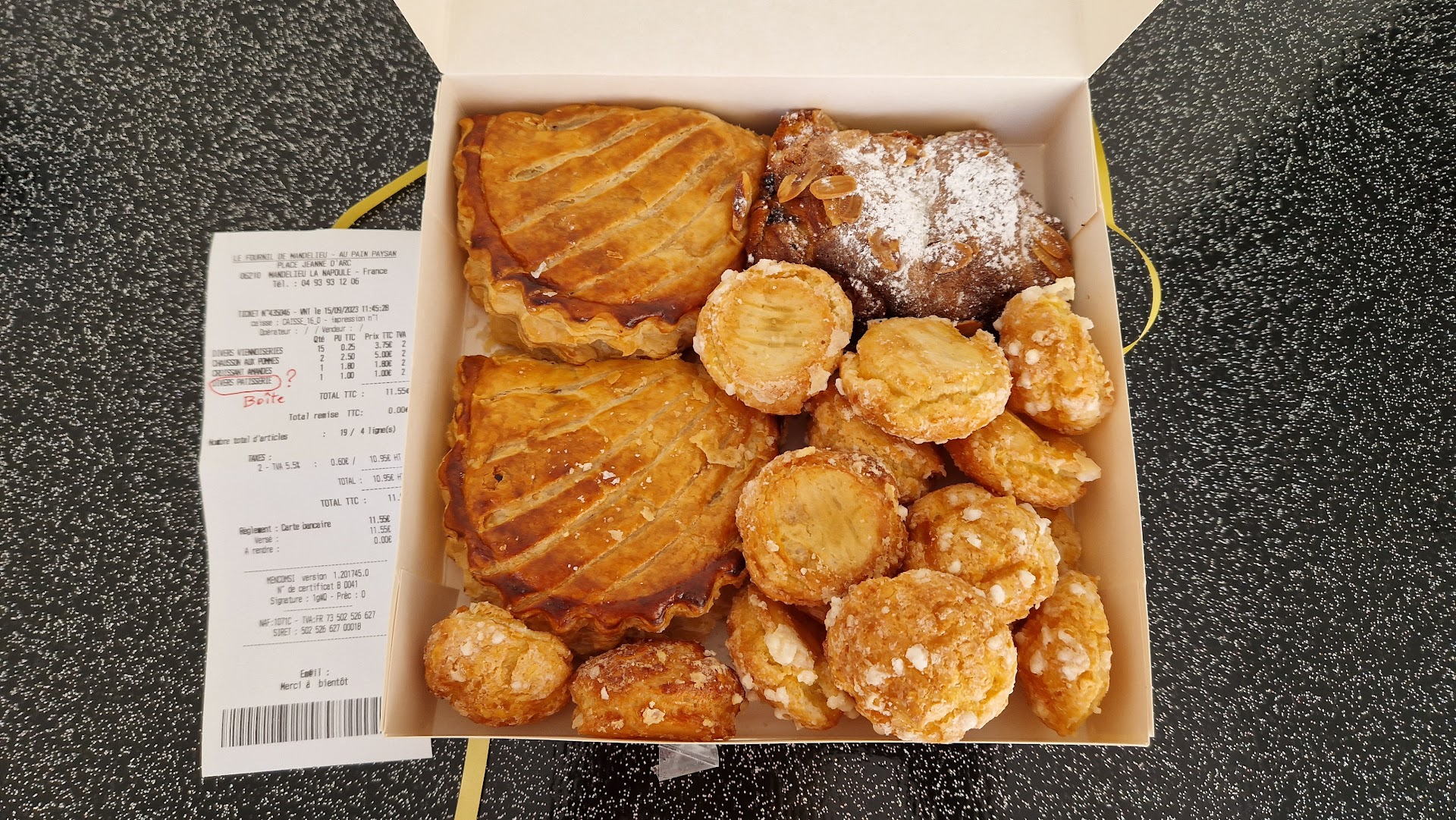Read moreEnvie de faire plaisir à un proche en résident Ehpad, achat dans cette boulangerie de 15 chouquettes et 3 viennoiseries. Je demande à la vendeuse de les mettre plutôt dans une boîte à la place de sachet papier pour éviter d'offrir un sachet imbibé de gras... Le montant s'élève a plus de 10€ et bien on me facture un supplément de 1 € pour le carton ! De surcroît sans même me prévenir. Si j'avais acheté 3 gâteaux ou une tarte, vous m'auriez compté l'emballage ! Un comportement pas très commerçant et qui ne vient certainement pas fidéliser la clientèle locale déjà confrontée à une inflation galopante. Il n'y a pas de petit profit chez ce commerçant apparemment ! Pour finir, les viennoiseries étaient bonnes selon mon proche mais les chouquettes étaient tres sèches, probablement...