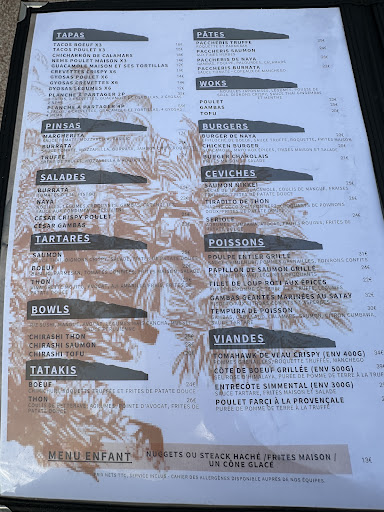Naya, Naya, Naya... Fake Fake Fake.... On nous a conseillĂ© ce restaurant avec ambiance musicale. RĂ©servation faite, ils ne sont pas au courant que c'est pour un anniv d'un enfant de 14 ans, malgrĂ© qu'on les ai prĂ©venus. 5 adultes, 3 enfants..... Pour une table dressĂ©e pour 9. Malheureusement pour eux, dans les 8 invitĂ©s, il y avait deux chefs de cuisine, pas lĂ pour juger mais en repos et avec l'envie de passer une bonne soirĂ©e. Donc nous connaissons bien les fournisseurs (mĂ©tro par exemple). Ce fut un enchaĂźnement d'attrape touriste. Planche dĂ©gustation a 32âŹ... Seule la planche en bois vaut le prix, pinsa sous vide, trois bols de sauces mĂ©tro, crevettes panĂ©es en surgelĂ©es mĂ©tro... Le pire, la guacamole de chez MĂ©tro mĂȘme pas relevĂ©e par un zeste de citron ou de piment. On passe aux plats: inspiration asiatique intĂ©ressante, cependant trĂšs vite dĂ©cevante. Gambas au panko sans panko, avec une panure Ă l'anglaise et surprise avec la mĂȘme guacamole fade et insipide de l'entrĂ©e. Seule la couleur verte nous permettait de deviner la prĂ©sence de l'avocat. Poulpe grillĂ© au riz achiote espagnol.... Tentacule de 160g arrivĂ©e sous vide et plongĂ©e dans l'eau. Si ma grand mĂšre mangeait ça, elle serait toujours en train de macher. Le clou du spectacle.... Poulet au brie et chimichouri et roquette qui se transforme, comme par magie en mesclun niçois cuit... Sauce au brie trĂšs bonne mais chimichouri aux Ă©pinards et poulet d'Ukraine ultra cuit. Nous avons dĂ©cidĂ© de ne pas tenter les desserts, malgrĂ© une demande de bougies pour l'anniv. Mais les cuisines fermaient. Nous avons commandĂ©s 5 cafĂ©s, trĂšs bons, mais qu'on a attendu une demi heure. Nous avons honorĂ© l'addition de 444âŹ, ce qui nous semble logique vu que nos trois ados ont repris des plats car pas rassasiĂ©s. 222⏠pour 4, en ayant pas bien mangĂ©, ça pique un peu.