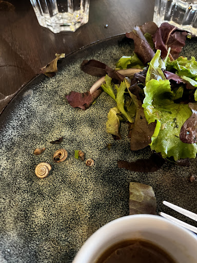 Read moreNous commandons quatre entrecôtes, deux bleues, deux à points. Les « deux entrecôtes bleues » arrivent, elle sont à point. Le serveur ne sait pas reconnaître la cuisson. Bref, une fois échangé avec nos voisins de table, nous pouvons commencer à manger. L’entrecôte et les frites sont bonnes. La salade… est remplie d’escargots ! J’en ai trouvé 5 dans mon assiette, dont deux encore vivants. Le serveur arrive pour constater cela… et prend les escargots dans sa main, directement dans mon assiette !! « On ne lave pas beaucoup la salade car sinon elle devient terreuse » ah bon ? C’est l’eau de lavage qui salit la salade ?