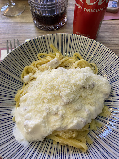 Les pùtes fourrées qui, quand on travaille un peu dans le milieu, littéralement sorties du sachet de chez Métro, et la sauce carbonara notamment coupée à l'eau, on se croirait à la cantine du collÚge mais pour le double du prix.