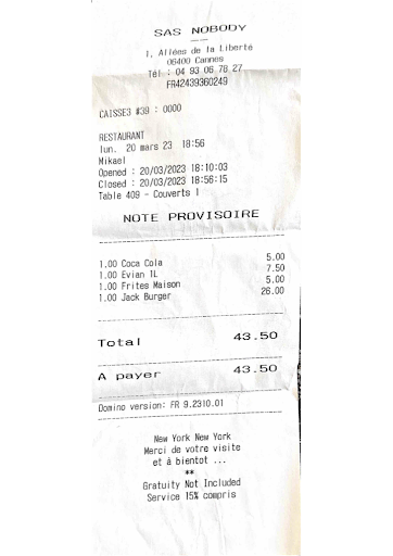 I had the Jack Daniels burger, water, and coke and the prices are listed in the receipt. Once I am done and asked for the cheque, the waiter came with a card machine and entered 67 euro for my meal. He did not print the ticket, he came with the card machine directly. Now the 67 euro was a shock and I was lost.