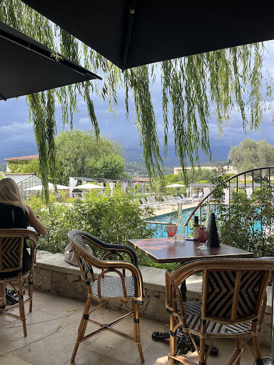 It's a beautiful day. Food is served outside on the terrace facing the pool. Rich bistro food topped with home made desserts in a beautiful setting. What's not to like?