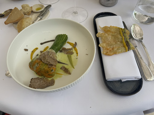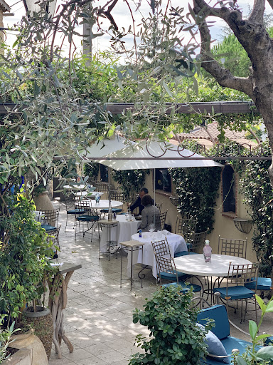 The restaurant is old stone and beautiful linen. It is just the kind of place to go when you want the feel of the South of France. The courtyard is shaded and had a light breeze blowing through. The interior is calling my name for a winter day. They have a fireplace, which will be perfect for those chilly days. The service is quiet, and professional. The staff is excellent at reading the mood of the table. My husband and I are quite relaxed, so the staff followed suit. The wine list is very nice, offering wines for the wallet-conscious and those who desire a great Burgundy. The food is fantastic! The amuse-bouche were delicious. I usually do not partake, but these were too good to miss.The menu is small but has offerings for meat and seafood lovers. We had the tomato entree as well as the zucchini flower. They each came with 3 different preparations. They all were excellent and beautiful to look at. We each had a fish. The preparation again was a pretty as delicious.