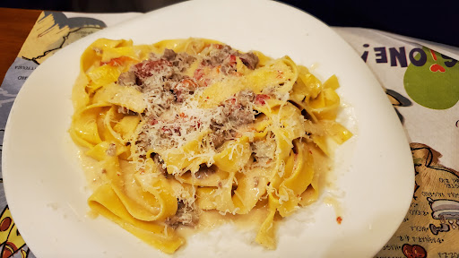 What an experience!! Most fun meal I've had in a month in Europe. Fabio and Sabina have a party going in a small space packed with fresh pasta, black truffles (she's happy to show you), magical cheese and sauce, and fresh bread and flatbread, plus a healthy dose of passion for food and life. My man had the lasagna, which was probably the best I've ever tasted - magical sauce nicely balanced with just enough cheese and plenty of meat to be flavorful, creamy, and hearty but not overwhelming. My piadine with truffle and sausage was amazing and generous: I'm looking forward to enjoying the second half for lunch. We complemented it with perfectly drinkable red table wine and finished with the best tiramisu I've had in my life (and I'm almost 50), made in house by Fabio - just enough sugar, and a little tango was in a lower layer of mascarpone with fluffier cream layer on top of the espresso-soaked ladyfingers. Nociola and Springsteen went with the tiramisu; Fabio likes his rock, and by the end of the evening we were all jamming out to Stairway to Heaven. I like to cook and enjoyed watching this duo work their magic. Yes, yes, yes! Seating is limited and they have plenty of fans, for...