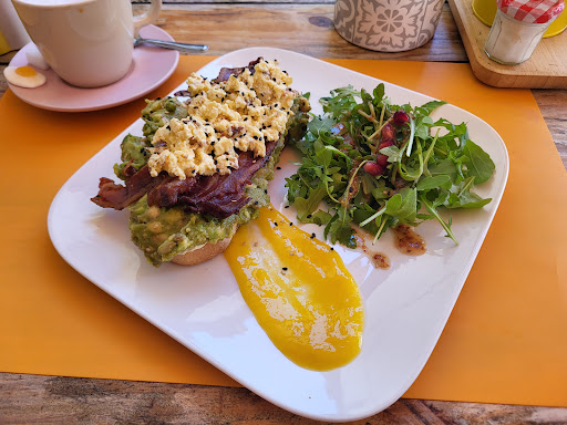 I had the avocado toast with scrambled egg and smoked salmon and it was really delicious and tasted fresh. My boyfriend had the brioche slices with fruit and he enjoyed it. Though the food was good the service was not. We went inside and asked the guy on the door if we could have one of the tables for two out the front and he said can you wait outside (baring in mind there were loads of available tables outside and inside), so we waited outside⊠and we waited⊠and we waited, during this time I was actually on my phone considering another place to eat. Then he finally comes 10 minutes later and gives us one of the tables. The people who arrived after us were seated much quicker then we were but he still made them wait a little bit (which was confusing because there were still many many tables available). Then he takes all of the people who arrived after us orders first even though we were trying to make eye contact to get his attention. After about 15 minutes I got up and asked him to come and take our order (very politely btw), he came around 5 minutes later to take our order. The same man that worked there bought the table next to us some water and as he put it down he accidentally smashed one of the glasses all over one of the ladies. I understand accidents happen but he did not care at all. He didnât apologise and he didnât even clean up all of the glass properly, we could see big shards of glass all over the floor and the poor lady it went on was wiping bits of glass off of her. He just looked like he didnât want to be there, no smiling, acted like he didnât care etc. We didnât get served by anyone else that worked there so cannot generalise this behaviour to the other employees. Food was good but service from this particular employee...