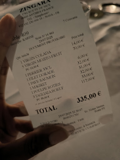 Concernant la carte, on nous a simplement indiqué de scanner un QR code. Jamais il n’a été question d’une carte en cours de mise à jour ni d’une différence de tarif. Et même si une serveuse l’avait mentionné, cela ne vous dispense en rien de respecter la loi. Vous êtes dans l’obligation légale d’afficher les prix exacts. Le prix affiché doit correspondre au montant facturé. Point final. Vous avez présenté un tarif à l’écran, et facturé un tarif supérieur, sans prévenir personne. C’est non seulement une faute, mais également une infraction à l’article L112-1 du Code de la consommation, qui impose l’affichage clair et lisible des prix, à jour et sans ambiguïté. Le Zingara tel qu’on l’a toujours connu n’aurait jamais permis ce genre de pratique.