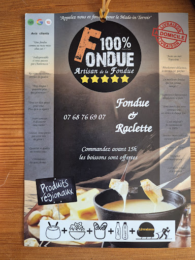 Read moreUne fondue, quels que soient les ingrédients, d'une très grande qualité, onctueuse à souhait. Par ailleurs, ces fondues sont amenées avec beaucoup de gentillesse, de simplicité, et tout donne envie d'y revenir. Le retour du matériel est facilité avec des horaires adaptés à la pratique du ski. Nous trouvons que le rapport qualité prix est très très bien, et toutes ces raisons font qu'il est très agréable de commander une fondue à Chamrousse avec 100% fondue, pour un partage à domicile, entre amis, famille... Merci beaucoup à Cécile et Jean Christophe pour proposer ce service et ces fondues. Bien entendu, nous ne pouvons que recommander...