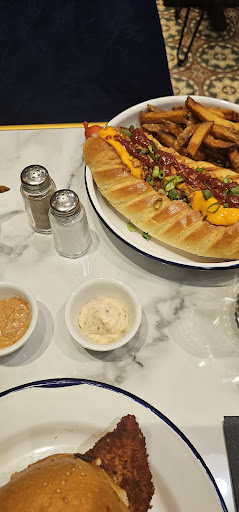 Accueil trĂšs chaleureux, prise de la commande trĂšs efficace et personnel trĂšs agrĂ©able TrĂšs belle salle, avec des tables aux motifs en marbre, et des prises de courant afin de charger son mobile ou autre, ainsi que des sanitaires bien entretenus, sauf du cĂŽtĂ© de la porte sur laquelle il faut forcer pour ĂȘtre certain de l'efficacitĂ© du verrou. De plus, le dĂ©cor de burger sur les murs avec une boule disco au plafond font un peu trop surcharger Une trĂšs bonne idĂ©e de proposer les burgers avec des versions poulet et vĂ©gĂ©tarienne Mes choix furent un menu avec burger (Cerdan version poulet), frites, et boisson, un hot-dog, une apple pie et un cafĂ© ristretto Pour les sauces, j'ai optĂ© pour la sauce relevĂ©e et la mayonnaise Service assez rapide, mais quelle surprise de voir que les cuisiniers ont une casquette et ne sont pas habillĂ©s pour leur poste... Burger vraiment bon avec un bon morceau de poulet panĂ©, une belle compotĂ©e d'oignons, de la raclette Ă souhait et quelques cornichons, seul souci : le bun un peu trop friable Frites trĂšs bien cuites, croustillantes et fondantes, mais lassante au fur et Ă mesure des bouchĂ©es Sauces relevĂ©es trĂšs bien faites tout comme la mayonnaise Du cĂŽtĂ© du hot-dog, un pain briochĂ© trĂšs industriel, qui se dĂ©truit en deux Ă la moitiĂ©, de surcroĂźt une saucisse qui trop le goĂ»t de l'industrielle, tout comme le fromage fondu, mais cela est oubliĂ© avec les oignons frits et la sauce Apple pie non faite Ă la minute : sous cloche sur le contoir, servie froide sans coulis de caramel, contrairement Ă ce qui est annoncĂ©, le fond de tarte ressemble davantage Ă un tiramisu qu'Ă de la pĂąte, trĂšs mou, sauf du cĂŽtĂ© des pommes, malgrĂ© un bon goĂ»t CafĂ© presque froid, il a Ă©tĂ© fait bien avant de servir la part d'"apple pie", mais tout de mĂȘme bon Rapport qualitĂ© prix moyen : 30e90... Vous pouvez vous faire votre propre avis, mais si vous avez le choix, pensez Ă ...
