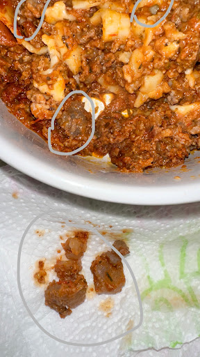 Je vous laisse juger par la photo très représentative. Les lasagnes ne sont même pas mangeables au vue du nombre de morceaux de couenne ultra dures dans la viande haché.