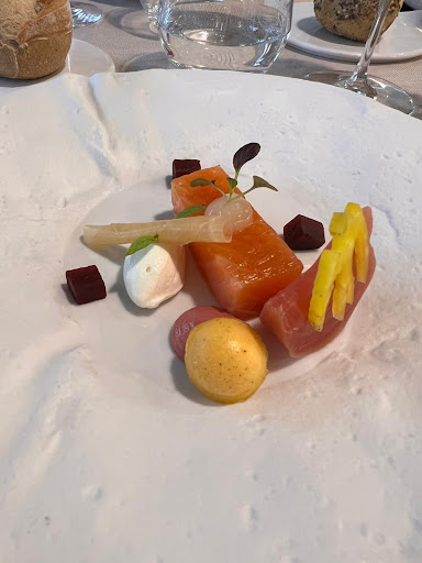 Nous sommes arrivés à 20h15 et avons quitté le restaurant à minuit, ce qui est très long pour un dîner. Le délai entre la prise de commande et l’arrivée des plats, ainsi qu’entre chaque plat, était interminable. Le service n’était pas à la hauteur du prix du menu. Nous avons commander un apéritif qui est arrivé au compte goûte et surtout pour ma maman, où son verre de vin est arrivé 20 min après la prise de commande. Ce qui fut assez gênant étant donné les amuses bouches déjà servi. De plus, quelques détails ont ajouté à notre déception : une des serveuses a fait tomber le petit papier servant à éviter les gouttes lors du service du vin et n’a pas pris la peine de le remplacer. Une assiette à pain manquait sur notre table et, bien que nous en ayons demandé une, elle a mis un temps considérable à arriver.