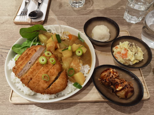 Read moreJe déconseille pour déjeuner ! Adepte des restaurants asiatiques et de la cuisine japonaise et coréenne, je suis très déçue par ce katsu curry qui ne rappel absolument pas le goût de la cuisine asiatique et qui n'avait d'ailleurs pas de goût du tout ! Manque de sel, la "sauce" curry n'avais pas de saveur, le riz était gorgé d'eau. Le poulet est pané avec de la simple chapelure, pas de la panko, ce qui est quand même un incontournable de cette cuisine et qui ferait la différence... On se rapproche d'une escalope Le Gaulois de supermarché et sans exagération, même la texture à l'intérieur du poulet y ressemble vraiment, comme si c'était des morceaux de poulet hachés et reconstitués. La chair était rosé. Je pose vraiment un très gros doute sur le "fait maison" du poulet que j'ai mangé. 🤨