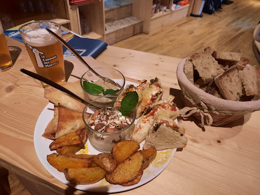 "Adrien Resch" n'est pas ce qu'on peut appeler une personne impartiale ou fiable. J'ai pris la planche "Moult Tapas" hier soir, et elle était composée : -de 2 samossas FAITS MAISON et sacrément bien remplis d'environ 10x10cm pour 2cm de hauteur -d'une verrine de caviar d'aubergines FAIT MAISON (j'insiste : le temps, c'est de l'argent, faire tout maison, c'est pas gratuit) à moitié remplie certes, mais suffisante pour faire 6 à 8 tartines -d'une verrine de labneh agrémentée de noix, noisettes, graines en tout genre, qui coûtent assez cher, même topo que le caviar d'aubergines pour le remplissage -de 4 sandwiches grillés étant chacun DEUX sandwiches coupés en deux (et non pas un, Adrien) au chèvre, aubergines grillées, et sauce cuisinée aux tomates, maison, dans les 3cm d'épaisseur chacun avec toute cette garniture -et d'une poignée de potatoes maison.