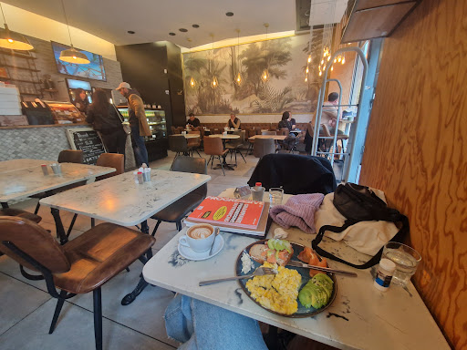 Cependant, le gros côté négatif : la vue sur la cuisine permet aux gens d'observer un peu comment c'est en terme d'hygiène etc & pour moi qui suis une personne très à cheval sur la propreté etc.. j'ai été un peu dégoûtée par le fait que même sur la plaque de cuisson, le cuisto retournait les tranches de pastrami à la main, puis les plongeait dans le bac à salade, puis manipulait les fruits, etc etc.. sans gants. Les contaminations croisées sont très fréquentes lorsque l'on utilise déjà de base les mêmes ustensiles pour la viande, les fruits, les légumes etc.. mais alors là, à même la main qu'il essuyait sur son tablier.. ça m'a vraiment mise mal à l'aise.. Il y a aussi les cinnamon rolls qui étaient fait avec de la pâte feuilletée comme les croissants & pains au chocolat, j'étais donc déçue à ce sujet mais c'est une question de goût je suppose.. Les plats sont très cher pour ce que c'est.