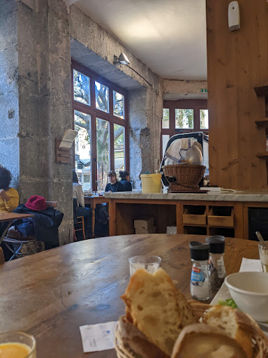 I was walking around Grenoble not knowing where to have something to eat. Wanted to avoid getting stuck in a snack- and junkfood routine because my stay in Grenoble was short. Saw that this restaurant was busy with a mix people whom were having a late brunch on Saturday, 14:30. No tourists it seemed, a couple of students, so, I thought I'd pop in. A warm welcome beyond the entrance and a clear, relatively short menu. A good sign. Fresh loafs of bread behind the counter along the wall, being cut into slices right before my eyes. Another good sign. Noticing that most people were enjoying a huge brunch, the wall chalk presented everything it entailed. For brunch one gets a fresh salad with smoked salmon, sliced french 'saucisson sec', Emmentaler cheese, mozzarella and tomato, with some dressing if so inclined, brie. Next to this one receives a semi breakfast plate filled with a big croissant (you choose what type), the lightest fresh yoghurt in a tiny glass vase seal using foil as if the milkman just past by, muesli with dried banana and nuts, butter and a soft boiled egg with long strips of bread to dip into the egg. A basket of different types of bread was provided to top it all off, including breakfast spreads like apricot jam, chocolate pasta, etc. Lastly to assist you in this long lunch, a freshly squeezed glass of orange juice, a glass of spring water from the mountains, and a cup of coffee. This meal is so rich and sizable that it'll get you up to Fort de la Bastille and back home again. And, you'll still not need a dinner afterwards... The service is experienced, friendly, and also attentive. Very quick to serve after ordering. And can understand English well enough to help with questions. Will come back again if...