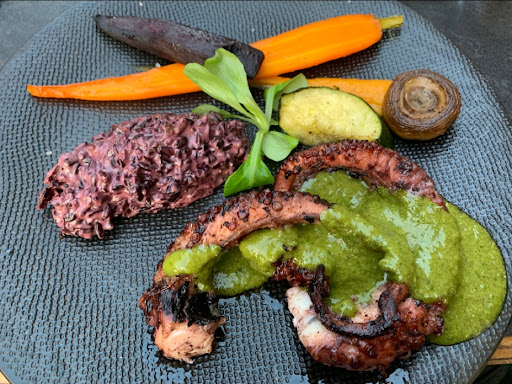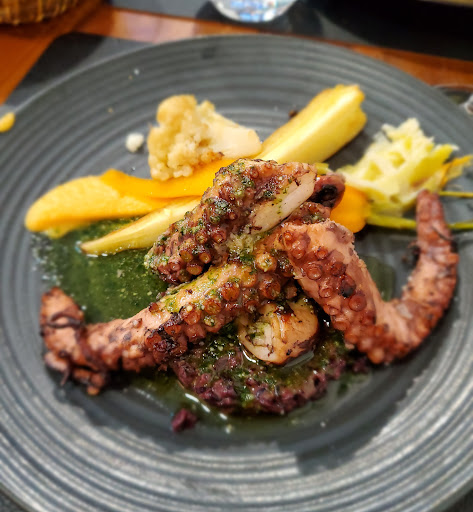 They offer typical prix fixe menus that combine appetizers, main course, and dessert. I ordered the salmon appetizer and octopus main dish, both of which were delicious and beautifully prepared. Despite the seemingly small size of the dishes, the food was enough for me, although I’ll admit that I wasn’t starving when we arrived. With the menu and glass of wine, we each paid 34€, definitely worth it for the quality...