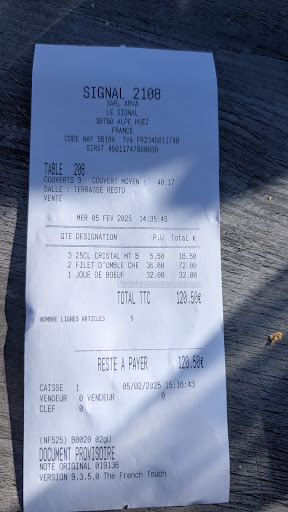 Read moreNous sommes venus entre amis espĂ©rant passer le rĂ©veillon du jour de lâan dans le restaurant. Le concept Ă©tait top sur la papier : montĂ©e en chenille, on mange Ă 2000 mĂštres dâaltitude et des repas de chef, clĂŽturĂ©s par un feu dâartifice, bref, dĂ©cidĂ©e Ă se dire « ok la soirĂ©e va coĂ»ter cher mais câest une occasion exceptionnelle âŠÂ »malgrĂ© la gentillesse des personnes du service, notre expĂ©rience est teintĂ©e dâun goĂ»t amer ⊠deux amis on dĂ» partir au bout de 3 repas puisquâune personne ne se sentait pas trĂšs bien Ă cause de ce quâelle avait mangĂ©. Nous avons Ă©tĂ© Ă©tonnĂ©s et déçue de voir que malgrĂ© les insinuations dâune serveuse ⊠aucun geste commercial nâa Ă©tĂ© appliquĂ© alors que les deux personnes nâont pas mangĂ© ni le plat de rĂ©sistance ni le dessert et sont repartis avec une note de 200⏠par personne (boissons comprises) sans avoir mangĂ© la totalitĂ©. Ăgalement déçu de ne pas avoir eu de feu dâartifice tirĂ©s du signal comme cela fut le cas certaines annĂ©es prĂ©cĂ©dentes. Nous avons pu avoir les 2/3 feux dâartifices du village dâen bas mais rien dâexceptionnel Ă la hauteur de lâexpĂ©rience que nous pensions vivre contenu du prix dĂ©pensĂ© Ă la soirĂ©e. En conclusion : trĂšs beau restaurant et bons plats mais nous vous attendez pas Ă des miracles⊠commerciaux ! Mention spĂ©ciale Ă la gentillesse tout de mĂȘme du service quand Ă la descente en moto neige dâurgence de nos amis qui ont dĂ» partir prĂ©cipitamment. Dommage que lâaddition nâa pas tenue compte des Ă©vĂ©nements de la soirĂ©e et surtout de la non consommation des prestations pour certaines personnes alors quâun arrangement semblait avoir Ă©tĂ© trouvĂ©. Personnellement, ils perdent...
