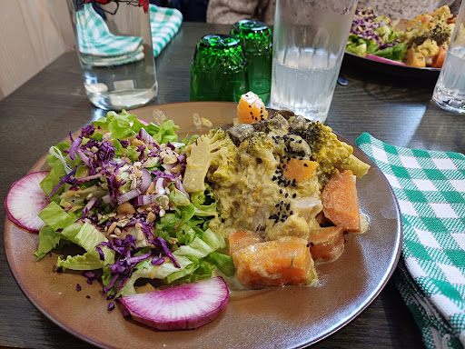 Super petit resto végétarien qui vient d'ouvrir. Tout est fait maison. Plat unique servi avec une salade composée. On s'est régalé ce midi avec des lasagnes végétariennes accompagnées d'endives braisées au jus d'orange et salade. Crumble, deux petites parts de gâteaux délicieux et crème fouettée au dessert. Service chaleureux, joli cadre. Parfait aussi le samedi matin pour boire un café, un thé ou une chicorée...