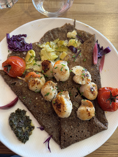 Étant 6, en pleine période touristique, nous avons pris soin de réserver le midi même, ce que je vous conseille car les crêperies sont souvent pleines à craquer par ici. Cependant, elles le sont pour la bonne cause car souvent délicieuses. Je n'avais pas d'attentes particulières vis à vis de ce petit restaurant en bord de port où le tumulte de la circulation saisonnière se fait ressentir. Cependant, nous avons tout de même choisi cette enseigne et nous n'avons, pour la plupart, pas été déçus. Un service jeune et pimpant, agréable et professionnel, des crêpes originales bien qu'il n'y ait pas un choix immense, ce qui, pour moi, n'est pas vraiment embêtant. Les galettes au blé noir sont à la fois moelleuses et craquantes, ni trop grasses ni trop sèches, le parfait combo en somme. Ces dernières sont d'ailleurs très bien garnies et généreuses, de quoi régaler vos papilles. Pour ma part, j'ai pris celle au saumon et j'ai été agréablement surprise en constatant les nombreux morceaux de poissons aux couleurs chaudes. Étant habituée à voir trois lamelles qui se battent en duel, c'était fort plaisant. Pour ce qui est du dessert, à savoir les crêpes sucrées, je me permets d'émettre un léger bémol. Elles sont, en grande majorité, légèrement écœurantes dû au trop plein de coulis ou d'association entre des aliments très sucrés séparément entrainant une overdose de saveurs. Je serais d'avis pour mettre un peu moins d'ingrédients, ce qui permettrait de sentir plus le goût de la crêpe qui, bien que très savoureux, se perd dans les méandres des coulis, des glaces ou des toppings. Sinon rien à ajouter, décoration bretonne plutôt sympathique et menu pour les enfants qui vous fera économiser 1 euros seulement mais vous offrira tout de même un sirop. Chouette compromis. Bonne adresse, je recommande à tous les ferues de...