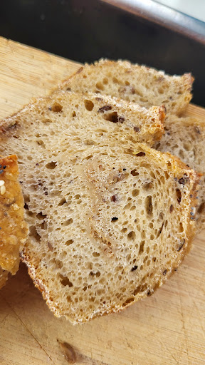 Read moreNous sommes tombés sur une mauvaise fournée la première fois, le petit pain que nous avons acheté 2,60€ n'était pas assez cuit (voir les 2 premières photos). Nous y sommes retournés et avons pris leur pain de campagne à la découpe (farine bio T80, au levain, 5€/kilo voir 3ème photo) qui s'est révélé excellent. Bonne conservation car au levain (important car nous allons mouiller 6 nuits sans avitaillement possible). Donc jugement revisé à la hausse, il faut reconnaître ses erreurs😊. Avec le joyeux accueil de la jeune vendeuse, cela fera...