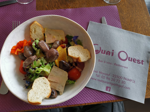 Je recommande très fortement le "Quai Ouest", restaurant donnant sur le port de Paimpol avec tables à l'extérieur sur trottoir, mais salle à l'étage, encore mieux avec vue à travers les baies vitrées, au calme. L'accueil particulièrement chaleureux et aimable, de Michèle la patronne et Nathalie en salle, est presque surprenant de nos jours, qu'elles soient remerciées. L'ambiance charmante voire cosy d'un endroit bien tenu avec goût, propre, aussi dans les ptis coins femme/homme. Aussi merci à David aux fourneaux qui propose une carte très variée et alléchante, allant du homard breton grillé vers l'entrecôte/frite classique en passant par noix de St-Jacques et autres poissons, sans oublier les desserts à se damner... Le repas était top, goûteux à un prix raisonnable, normal...que demander de plus?