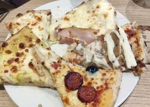 Un choix hallucinant de pizza, j'en ai testĂ© 8 que j'ai trouvĂ©es chaudes et gourmandes. Le goĂ»t est agrĂ©able (pĂąte Ă©paisse, fromage gĂ©nĂ©reux et bien gratinĂ©). Aucun soucis de ce cĂŽtĂ©. Concernant le buffet froid, ce sont des lĂ©gumes bien sĂ©parĂ©s, rien d'extraordinaire mais j'ai apprĂ©ciĂ© cette sĂ©paration pour me permettre de choisir ce que j'aime. Les fromages prĂ©sentĂ© sont un peu triste sans mise en valeur (petit effort supplĂ©mentaire Ă faire pour valoriser cette section). CĂŽtĂ© pĂątes, ça reste des pĂątes. Rien d'extraordinaire, j'en ai goĂ»tĂ© et c'Ă©tait bon Mais je n'en reprendrait pas par plaisir. Puis direction les desserts. J'ai tellement aimĂ© les tiramisu ! Pas d'alcool, doux, agrĂ©ables et lĂ©gers j'ai vu d'autres produits Ă tenter la prochaine fois (j'y retourne !) Ćufs neige part tarte,... Les boissons vraiment au bon prix (CafĂ© Ă seulemenht 1 euro, cocktails,...) . Le personnel souriant qui nettoye tables et fauteuils, ça fait plaisir.
