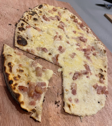 Les commandes se font et recevons rapidement nos boissons. En entrée nous choisissons une grande flamm au munster mais le choix fût rude car elles ont toutes l’air aussi bonnes les unes que les autres ! Et effectivement, elle était excellente. Cela faisait longtemps que je n’en avais pas mangé une aussi bonne ! 🤤 Je pense qu’on y reviendra juste pour toutes les tester… 😏