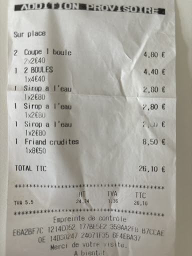 Read moreJ ai vu les critiques et je suis tout a fait d'accord avec la patronne je n aurais pas accepté non plus de prendre des clients qui prennent la glace ailleurs et viennent s installés à la terrasse ca nse fait pas justement que ce soit adulte ou enfant!j aimerais bien voir vous si vous étiez a la place de la patronne!et pour les personnes qui rentre en poussette vous voyait bien que la salle est pti et n est pas adaptée à prendre des poussette ou autre!comment voulez que les personnes qui travaillent la bas circule correctement ou pour les clients qui vont au toilette ou qui s installe pour boire leurs café tranquillement?pour moi personnellement la patronne est toujours agréable quand j y vais et c est une bosseuse ! Par contre pour la terrasse c est vrai que le service est un peux lent mais pas grave pour 5 ou 10 minutes d attente en plus c est pas la fin du monde je viendrai...