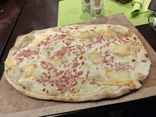 Read moreНачиналось все хорошо. Место интересное. Приветливая официантка быстро принесла меню и напитки. Заказали разные пиццы и я себе фламмкухен "Munster". Второй фламмкухен заказали яблочный и попросили принести позже (что бы не остыл, да и на стол он там уже не поместился бы). Выбор блюд был обусловлен тем, что в зале стояла печь, в которой их готовили. Еду принесли быстро - минут через 15. Одна пицца и фламмкухен были отмечены в меню символом ресторана "избранное", поэтому ожидалось, что то особенное. Но... Фламмкухен средненький и даже сыр с непонятным названием его не вытягивал. Пицца тоже не "огонь" - тесто хорошее, но начинка какая то "пресная", в ней явно не хватало специй (каких-нибудь травок). Т.е. еда на слабенькую четверочку. Ни во время еды, ни когда мы уже все доели, к нам никто из официантов не подошел (хотя ресторан был полупустой). Официантка, что принимала заказ, вовсе куда то пропала. Мы ждали ее больше 5 минут. Она пришла в зал, но к нам не подошла. Позвали. Она бросила дежурную фразу "Десерт? Кофе?". Мы сказали "нет", т.к. заказанного яблочного фламмкухена было бы нам достаточно. Официантка ушла, но вместо фламмкухена она принесла счет и снова ушла. Даже не спросила "карта или наличные?". Фламмкухена в счете не было. Я округлил счет до кратного 10 и заплатил наличными. Даже 1.5-2€, что я добавил к счету, было жалко там...