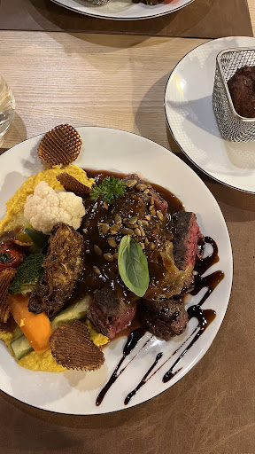 Je suis allĂ©e dĂźner ce soir avec ma maman dans ce restaurant. Tout se passait bien au dĂ©but, nous avons commandĂ© une tarte flambĂ©e, qui Ă©tait trĂšs bonne !! Nous avons reçus nos plats. Ma mĂšre a pris le burger de saumon, quâelle a beaucoup apprĂ©ciĂ©, et jâai pris lâonglet de bĆuf. Quand jâai commencĂ© Ă manger la viande, je me suis rendue compte que les morceaux Ă©taient casiment immangeables, Ă moins de passer 10 min avec chaque morceau en bouche. Certains morceaux Ă©taient bons, mais câĂ©tait une minoritĂ©. RĂ©sultat : jâai dĂ» laisser plus de la moitiĂ© de la viande dans lâassiette (le plat Ă©tant Ă 23âŹ, ça fait mal). Je dis poliment Ă la serveuse que je nâai pas pu manger la moitiĂ© de la viande, et elle sâexcuse directement et me dit quâelle mâoffre les boissons pour le dĂ©dommagement. Mais quand nous nous sommes levĂ©s pour payer lâaddition, câest une autre serveuse qui nous a encaissĂ©. Une dame assez jeune, aux cheveux longs et foncĂ©s. Elle avait lâair hautaine, et quand je lui ai prĂ©cisĂ© que « votre collĂšgue a dit quâon aurait une remise sur les boissons en dĂ©dommagement », elle rĂ©pond dâun ton sec et ironique « ah ouais, elle est bien sympa elle! » puis « bon je vous retire juste une des boissons », sans mĂȘme me demander laquelle Ă©tait la mienne (elle a enlevĂ© la moins cher des deux). Elle Ă©tait visiblement Ă©nervĂ©e (mĂȘme dĂ©jĂ avant de nous encaisser). Déçue de la rĂ©action de cette derniĂšre et aussi de la qualitĂ© de la viande, malgrĂ© le plat qui donnait envie, je vous laisse avec la photo...