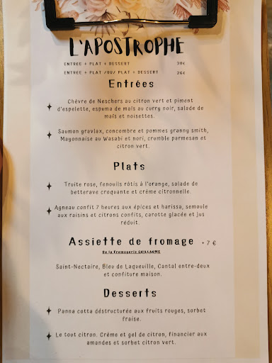 Read moreSi pour un restaurant, le fait d'ĂȘtre complet chaque jour est un gage de qualitĂ© alors cela s'applique parfaitement Ă cet Apostrophe. LovĂ© dans un petit local oĂč le bois brulĂ© cĂŽtoie la verriĂšre d'atelier, le restaurant se hisse doucement mais sĂ»rement dans la liste de nos bonnes adresses. Lâaccueil est souriant et convivial. On nous place Ă une table assez spacieuse pour ne pas avoir l'impression de manger sur un timbre-poste. Ici on prĂ©fĂšre l'aisance des convives Ă la rentabilitĂ© au mÂČ. RĂ©sultat, une vingtaine de couverts Ă chaque service, pas plus. Le menu est restreint (2 entrĂ©es, 2 plats, 2 desserts), gage de qualitĂ© et de fraicheur des produits. Les plats changent rĂ©guliĂšrement (environ tous les mois). Une cuisine raffinĂ©e sans ĂȘtre ostentatoire ou prĂ©tentieuse. On sent l'envie de bien faire, de contenter ses clients. Des alliances gustatives originales. Le service est attentionnĂ© sans ĂȘtre pĂ©dant. Les prix sont des plus abordables (compter une trentaine d'⏠pour la formule 3 plats). Les vins sont de bonne facture (petit bĂ©mol sur le cĂŽte de Gascogne qui ne nous a pas portĂ© aux nues). C'est en tous cas un lieu plaisant Ă qui l'on prĂ©dit un bel avenir (un Bib gourmand...