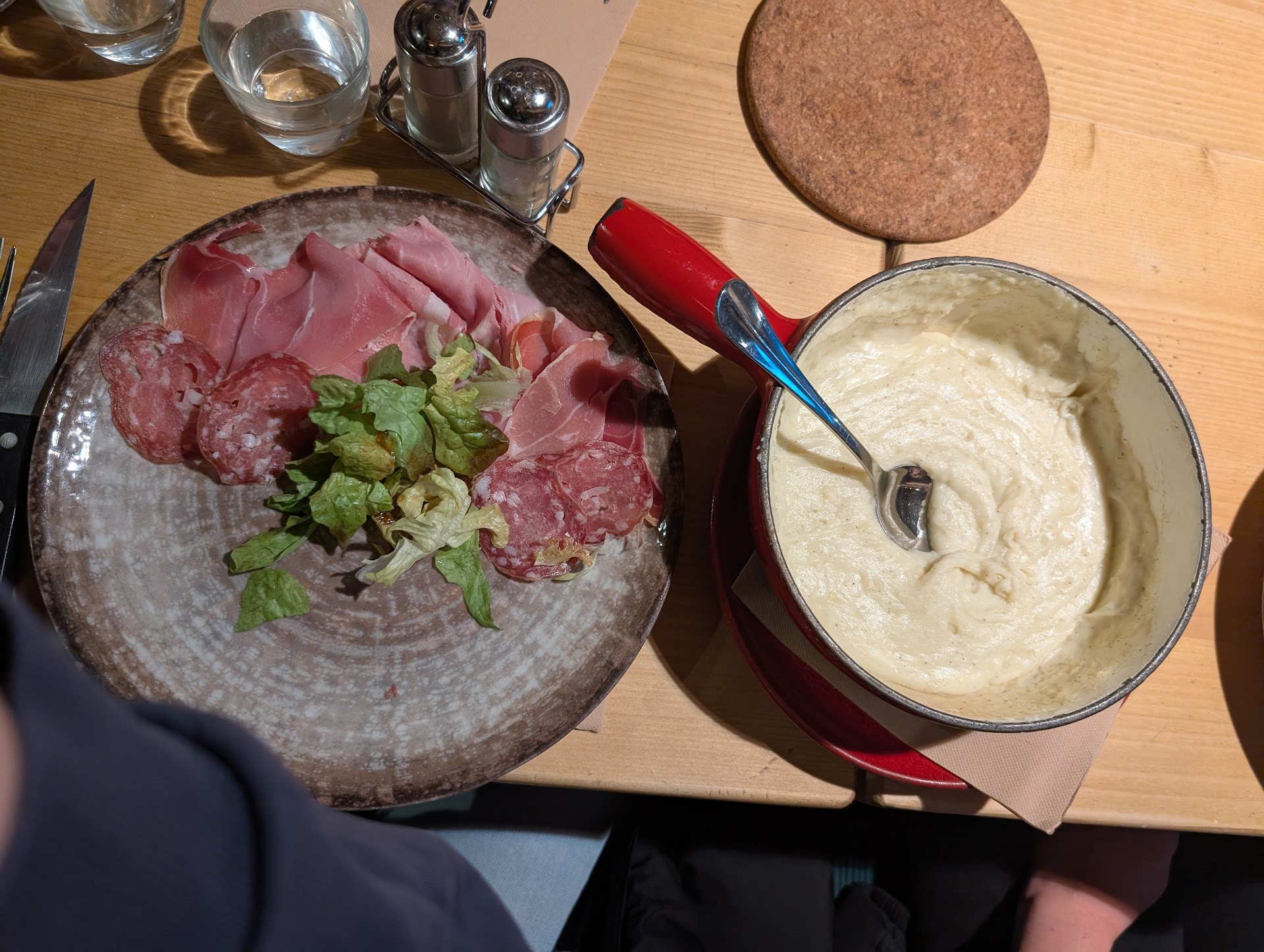 Nous avons mangé le dimanche 8 juin 2025. Il faisait beau. Nous avons pris une salade au chèvre miel. Bien garnie, copieuse mais trop de vinaigrette, ça baignait dans la sauce. Nous avions pris un filet mignon de cochon 300gr. À première vue cela ne faisait pas les 300gr malgré l’assurance du chef. La ratatouille était dans un ramequin minuscule, dommage car elle était bonne. Les frites étaient bonnes. Le service était très bien, aux petits soins et pro et souriant. On avait demandé une table avec vue extérieure. Bon il ne faut pas y aller pour la vue, car vous voyez un bâtiment et pas les montagnes. La première salle est un peu sombre mais l’ambiance est différente de la deuxième. Chacune son style. La première grosses pierres, tamisée et télé présente avec foot. Bistrot bar chaleureux. La deuxième est plus bois et peaux de bêtes plus familiale et plus lumineuse et l’hiver la cheminée fait son effet. C’était un weekend où il n’y avait pas grand monde, donc plutôt tranquille et calme en haute saison c’est plus bruyant (on l’a fait en haute saison aussi) et attention au parking en...