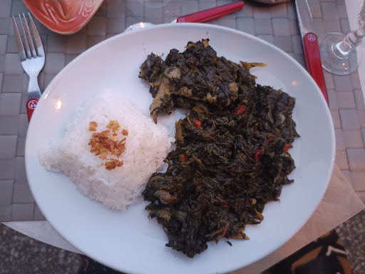 Le soleil était au rendez-vous, ce midi. Dans le ciel, dans l'assiette, et dans nos cœurs grâce à l'accueil chaleureux et le sourire de la patronne et sa fille. Nous cherchions un restaurant où nous pourrions trouver des plats végétariens. Google nous a indiqué La Sanaga et nous voilà en quête de la cuisine Africaine dans les rues d'Issoire. Jour de chance, Laura a cuisiné aujourd'hui un plat à base de haricots, accompagné d'épinards, de bananes plantains, de manioc et de taro. Nous avons déjeuné en terrasse, avec une bonne bière du Gabon, musique ensoleillée en fond. Produits frais, cuisine généreuse, tarifs tout à fait corrects. Merci encore pour ce moment très agréable, nous reviendrons...