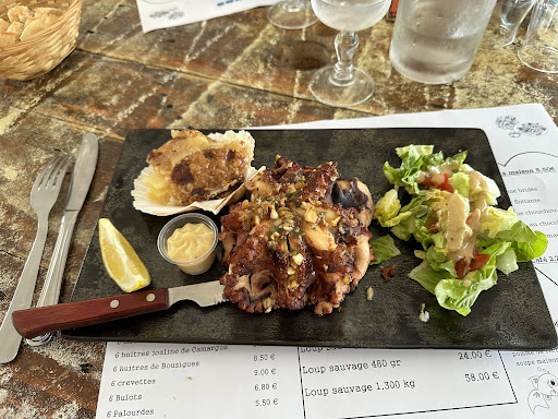 Nous étions venus, il y a deux ans ou un an, j’avais noté 10/10. Mais là j’ai baissé la note pour deux raisons, nous avons pris deux poulpe et dans l’après-midi nous avons eu des relans d ail jusqu’au soir, avec un goût de poulpe non désiré, j’aime pourtant ton ail et j’en mange presque à tous les repas quand c’est possible, mais là j’étais obligé de gratter tout l’ail qui avait sur le poulpe mais j’ai dû en avaler déjà un peu avant. Idem pour ma femme, le pain n’avait pas été livré et on a eu droit à du pain, rassis de la veille avec les huîtres sans un mot d’excuse comme si c’était normal, on a vu le pain arrivé bien plus tard livré dans la cuisine vers 13 heures c’est dommage car les huîtres sans le pain.frais et le beurre , le plaisir est diminué, les huiles sont excellentes mais ça ne vient pas du cuisinier. Bien sûr. Bref j’ai été déçu, je n’ai pas été malade mais limite limite mais femme maux de ventre trop d’ail, masque le goût du poulpe qui lui était tendre, mais le goût est resté toute la journée, c’est bizarre. Ma question est ; le poulpe, était-il vraiment frais et je crois que dans les restaurants ils ont l’obligation maintenant de préciser si le produit est congelé ou frais, fait maison est une chose, produit frais et une autre chose je sais pas si le poulpe était congelé ou pas Them pour les autres produits mis en avant, ce n’est pas précisé. C’est pourtant très simple de l’imprimer sur le menu qui est en pièce jointe voir mes photos Bref je pense que je n’y reviendrai plus. C’est bien dommage pour des petits détails de rien du tout d’autant que je m’en suis rendu compte que dans l’après-midi pour l’ail. Le prix est un peu excessif aussi et on n’a pas pris de dessert. Ça nous aurait fait monter l’addition après de 80 € pour deux personnes avec un plateau de six huîtres deux poupes deux cafés, ça faisait déjà pas mal. Nous n’avons pris qu’une carafe d’eau. Pour info nous étions arrivés. Presque les premiers, on a été servi assez vite, on a remarqué que les habitués sont les bienvenus. La bise etc. est servie rapidement. Le touriste Lamba qui arrive un peu plus tard, semble attendre beaucoup plus longtemps sans excuse réelle de la part...